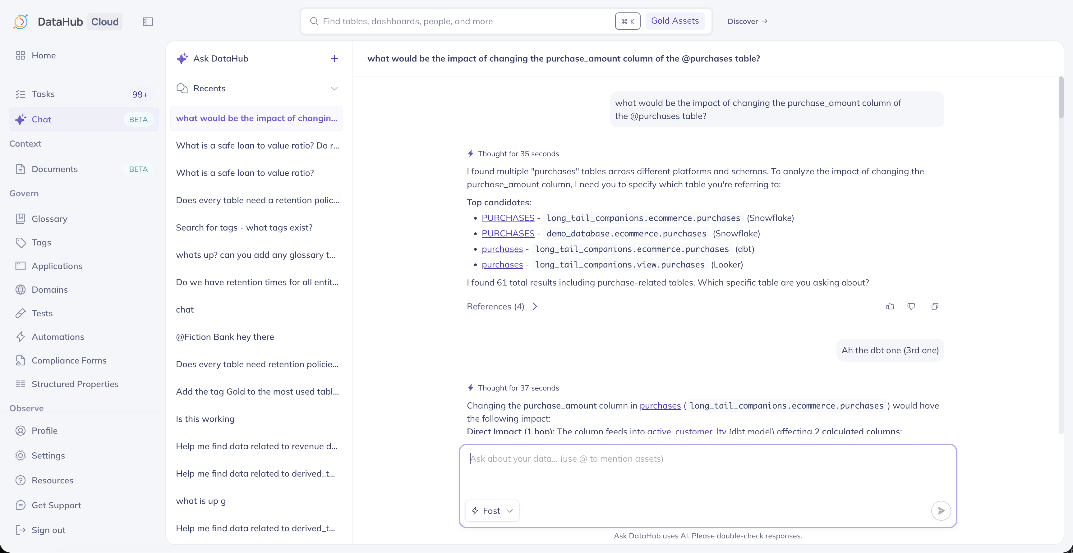 Quickly assess how changes to a data asset will ripple through your organization. Ask DataHub can trace lineage and identify all downstream dependencies, helping you make informed decisions before making changes.